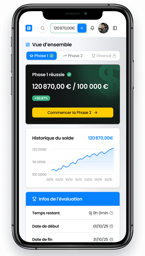 Passe notre évaluation en deux phases et débloque ta bankroll financée.