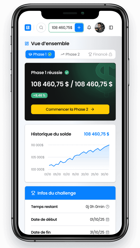 Passe notre évaluation en deux phases et débloque ta bankroll financée.